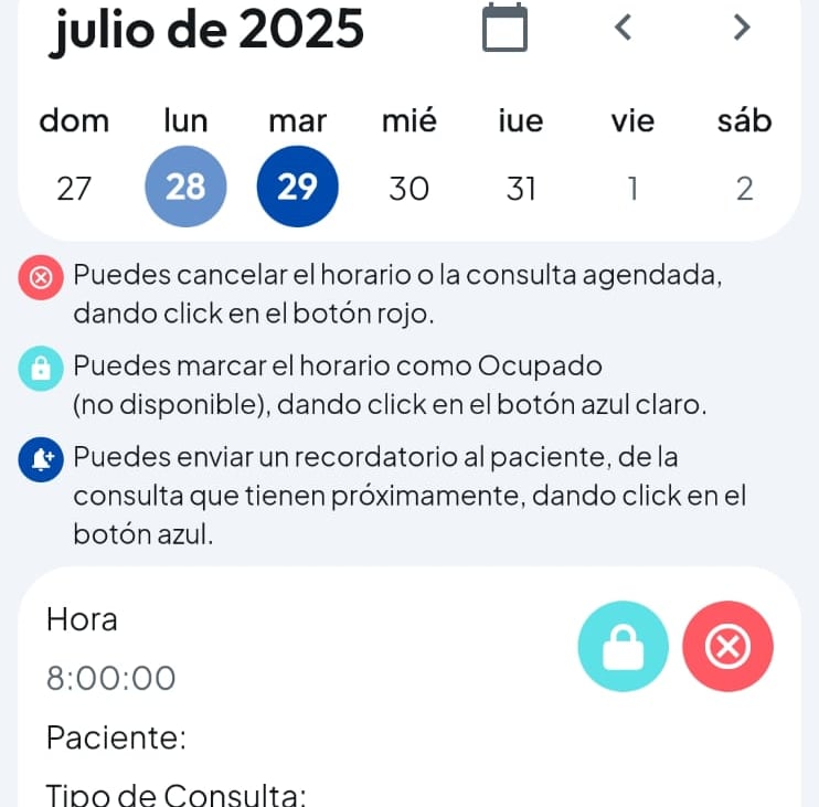 Podrás integrar todas tus consultas, tanto las agendadas en la app, como las que agendes por tu cuenta, en la agenda de la app y tener toda la información en un mismo lugar